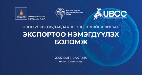 Улаанбаатар хотын худалдааны танхим /УБХТ/, МҮХАҮТ, Засгийн газрын хэрэгжүүлэгч агентлаг Хөрөнгө оруулалт, худалдааны газар хамтран худалдааг хөнгөвчлөх, уул уурхайн бус, нэмүү өртөг шингэсэн бараа, бүтээгдэхүүний экспортыг нэмэгдүүлэх, гадаад зах зээлд сурталчлах, худалдан авагчтай холбох, олон улсын зах зээлийн мэдээ, мэдээллээр хангах, зөвлөгөө өгөх зорилгоор “Олон улсын худалдааны хэрэгслийг ашиглан экспортоо нэмэгдүүлэх боломж” сэдэвт сургалт 10-р сарын 21-нд амжилттай зохион байгууллаа.