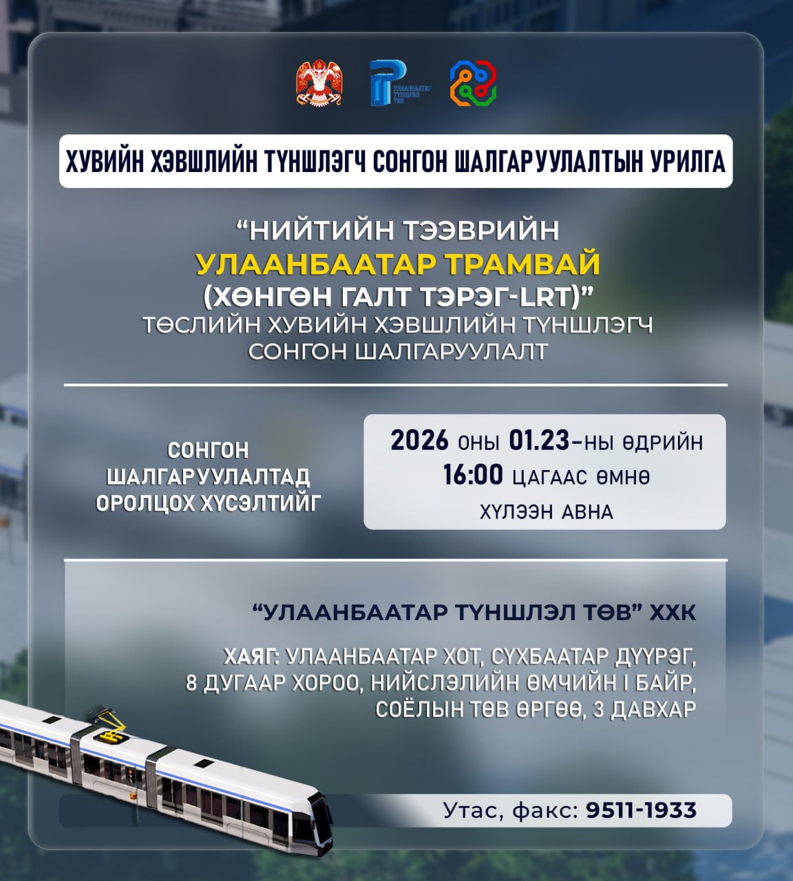 “НИЙТИЙН ТЭЭВРИЙН УЛААНБААТАР ТРАМВАЙ (ХӨНГӨН ГАЛТ ТЭРЭГ-LRT)” ТӨСЛИЙН СОНГОН ШАЛГАРУУЛАЛТЫН ХҮСЭЛТ АВАХ ХУГАЦААГ СУНГАЛАА